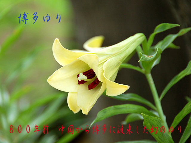 延喜21年(921)に醍醐天皇の勅によって筑前大分宮(穂波宮)から遷座したとされる神社。 祭神は八幡大神(応神天皇)及び応神天皇の母である神功皇后、そして玉依姫で、別名・筥崎八幡宮ともいい、 宇佐・石清水とともに三大八幡宮に数えられています。 幻のゆり「博多ゆり」は800年前 中国から渡来したと伝えられている 咲き始めは黄色いのが特徴。