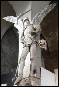 | 島はもともとモン・トンブ(墓の山)と呼ばれ先住民のケルト人が信仰する聖地であった。 708年:アヴランシュ司教オベールが夢のなかで大天使ミカエルから「この岩山に聖堂を建てよ」とのお告げを受けにより礼拝堂が作られた。 はじめは悪魔の悪戯だと思い信じなかったが、3度目に同じ夢を見たときに大天使はしびれを切らし、今度はオベールの額に指を触れて強く命じたところ、オベールは稲妻が脳天を走る夢を見た。翌朝、オベールは自分の頭に手を置くと脳天に穴が開いていることに気づいて愕然とし、 大天使ミカエルのお告げが本物であると確信した.. 百年戦争の期間:島全体が英仏海峡に浮かぶ要塞の役目をしていた。モン・サン=ミシェルの入り口には今もイギリス軍が捨てていった大砲とその弾が残っている。18世紀末:フランス革命時に修道院は廃止され1863年まで国の監獄として使用された。 1865年:荒廃していたが、ヴィクトル・ユゴーの紹介がナポレオン3世を動かし、再び修道院として復元され、ミサが行われるようになった。 1877年:陸との間に堤防を造成して鉄道・道路ができ陸続きになりフランス西部の有数の観光地となった。大天使ミカエルは「4大天使」の一人で、知力に優れた大天使で、神の使いとして天と地を往復する役割を持っているとされ、かのジャンヌ・ダルクにも神の啓示を与え、 軍隊を動かすリーダーとしての力を与えたと云われている。 |